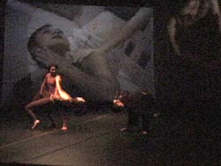 ACTG: using Director (a software program) the letters ACTG [representing the basic four chemicals within DNA: adenine (A), thymine (T), guanine (G), cytosine (C)] are extracted from a random ordered list of keywords associated with some of the thematic starting points of this project -- in particular the human genome. This extraction occurs at 8 second intervals (corresponding with the lag time of the video stream between the two spaces). Choreographic material has been devised that can be performed to correspond with the order of the letters. There is a video stream between both spaces and a data link that will synchronize the extraction intervals. Twins: a projected pre-recorded video is played alongside a moving camera projection of a duet. This imagery is streamed between the two spaces. The movement for this duet was created in a very small space -- from the thematic starting points of "touch and intimacy". Both live and pre-recorded choreography is corresponding. Virtual Partnering: this piece began with duet material that has been expanded to a quartet where one of the dancers is located on the Intelligent Stage and the other three on the Dance Stage. The two spaces are linked via a video stream and the timing of the movement is cued so as to give the impression that the dancing is taking place simultaneously. In fact, the two spaces experience an 8 second lag time using the video stream. No data is being sent between the spaces during this Cellbyte. In all of this work, the choreographers had to constantly remind themselves that they were choreographing for three spaces (the two spaces here at ASU and the web) at the same time. Jennifer Tsukayama made the observation that this was akin to playing 3-D Tic Tac Toe. Memory: during this Cellbyte, a trio on the Intelligent Stage space improvises using movement derived from still images of body parts. These images are triggered by the dancers' movements using the Very Nervous System and played back using a real time video editing software called Image/ine. In the Dance Stage #132, a single dancer also improvises with movements and floor patterns that correspond to animated projections (a spiral, a series of tubes and something resembling a small brush stroke). These animations are built and played in Director (a multimedia interactive authoring program). There is a video stream between the Dance Studio and the Intelligent Stage, and not vice versa. Movement data is being sent between the two spaces to trigger sound. Outside: The two spaces are approximately a 10 minute walk across campus. Outside explores notions of remote presence by utilising an electronic transmitter to send an video image as a dancer, carrying a camera, leaves one of the spaces to go to the other space. At the same time, another dancer leaves from the other space also carrying a camera and image transmitter. As one dancer moves out of transmission range in one space, the other dancer begins to move into range. This work is most effective at the edges of its space -- firstly the physical edge -- as the dancer moves out of the studio space -- and secondly at its media edge -- where the dancer/ camera operator reaches the edge of the transmission range and the image "fuzzes out". Stethoscope: A stethoscope is connected to a transmitter and receiver in order to pick up and amplify body sounds such as the heartbeat as well as the sounds of someone striking the body or "drumming" variously in different places. Video streaming and data (generated by a heart rate monitor and the motion of the body drummer picked up via the VNS system -- see triggers and sensors) are connecting the two spaces. Feedback: a camera set up to transmit its image in real-time is positioned in order to receive its own image. The effect over time is of receding iterations into the background -- a growing depth in the image. In this particular feedback loop -- the loop is actually established to include both spaces. Contact: Touch, intimacy, presence and play are all explored in a closing contact improvisation with moving camera. Video is streamed between both spaces and movement data is sent from one to the other triggering sound and possibly lighting changes in the spaces. |