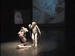 Lag TimeQuestions and Answers:Question #4: there is apparently an 8 second lag in the image going one way between the two spaces. What sorts of strategies might you use to use the lag, draw attention to it, or try to nullify it. Answer #1: The lag is only noticeable if the link is reciprocal. Remove the reciprocal link and the lag is unnoticeable. You can rehearse the lag so as to incorporate it into the choreography, or draw attention to the lag by using it in loops between the spaces. (John Mitchell) Answer #2: I don't think it's all that interesting (or even possible) to try to nullify this lag. I think it's pretty interesting anyway. I'm actually quite interested in increasing the lag, almost to a point of saturation. One idea relating to this is to make a loop using the stream, so that video from point A goes to point B then back to A then to B and so on. This would provide a potentially infinite series of time 'slices' spaced 8 seconds apart, so that one could see what is happening now alongside what happened 8 seconds ago, 16 seconds ago, 24 seconds ago and so on. This would provide an interesting way to create traces of movement through time. (Jo Hyde) Answer #3:I think to nullify the 8 second lag is ignoring an uncompromising component of the technology-- Which is contrary to one of the many objectives in this project. I prefer to think of the lag as another choreographic tool. Something that expands the choregraphic process. In using this new tool the viewers cannot help but notice it. However, to make a point of drawing attention to it (i.e., program notes, verbal announcements, etc...) does a couple of things. First, you (the collective "you") assume the viewers are unable to determine what is happening without us telling them. Second, it prevents the viewers from watching the works without prempting them, which will ultimately change their interpretations of the work. (Jennifer Tsukayama) |