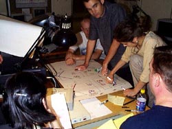 Mapping MediaSunday, 23 July, two groups split up to map out materials. The media/ technical artists mapped out the media environment for each movement or performance section made so far. The choreographers and dancers met in another space to review movement and performance materials. Cross over was made between the two groups to enable weaving. Questions and Answers:Question #8: what are some of the fundamental differences and/ or similarities between the experience of those on the stage and those behind the computers? Answer Pending: Question #13: write about the gap or lack of one you feel might exist between the dancers, choreographers, media or technical artists· and some of the reasons for this. Answer #1: Within the short period we had and considering the amount of different things each one of us had to do, I think we have done quite well to have developed some understanding of each others' particular domain or area of interest. But we never had enough time to focus on any particular exploration or experimentation one want to pursue, which is frustrating. However, the good thing is it opened up new areas of exploration for all of us and in my case will definitely lead to future creative work incorporating that knowledge. I would have liked to have at least one more week to play before trying to put things together. (Jayachandran Palazy) Question #18: Where do you see the issues of content and form evolving in the context of this project? Answer Pending: |